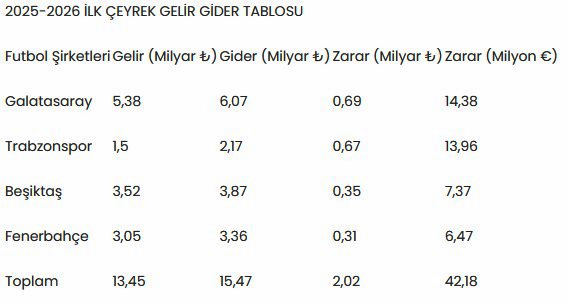 Türk futbolunun lokomotifleri olarak nitelenen Beşiktaş, Fenerbahçe, Galatasaray ve Trabzonspor’un borsaya açık şirketleri, 2025-26 sezonunun ilk 3 ayında 2,02 milyar lira zarara uğradı.
