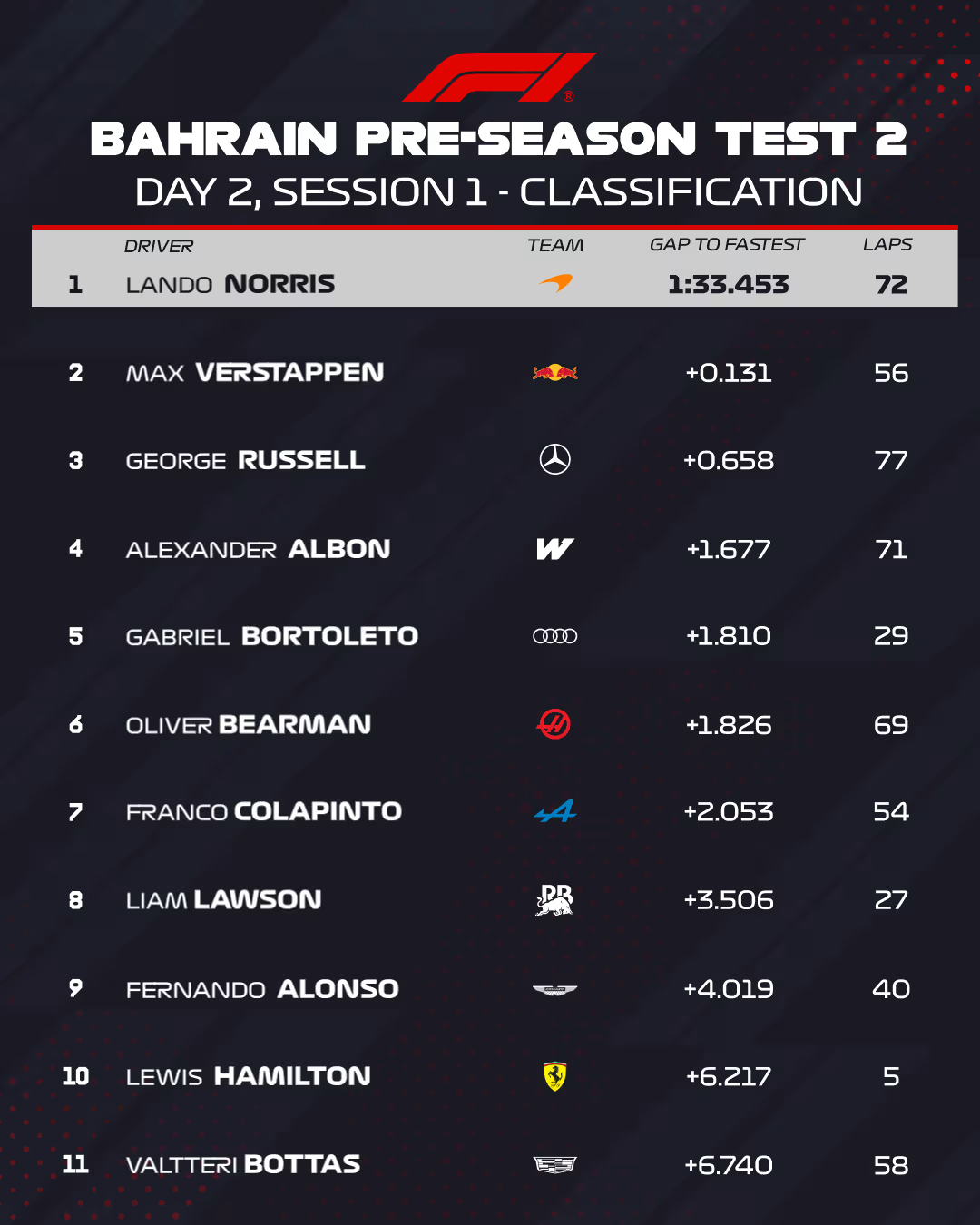Alex Albon, Ollie Bearman ve Franco Colapinto da Williams, Haas ve Alpine adına önemli sayıda tur atarak sırasıyla dördüncü, altıncı ve yedinci oldu; aralarına Audi pilotu Gabriel Bortoleto girdi.