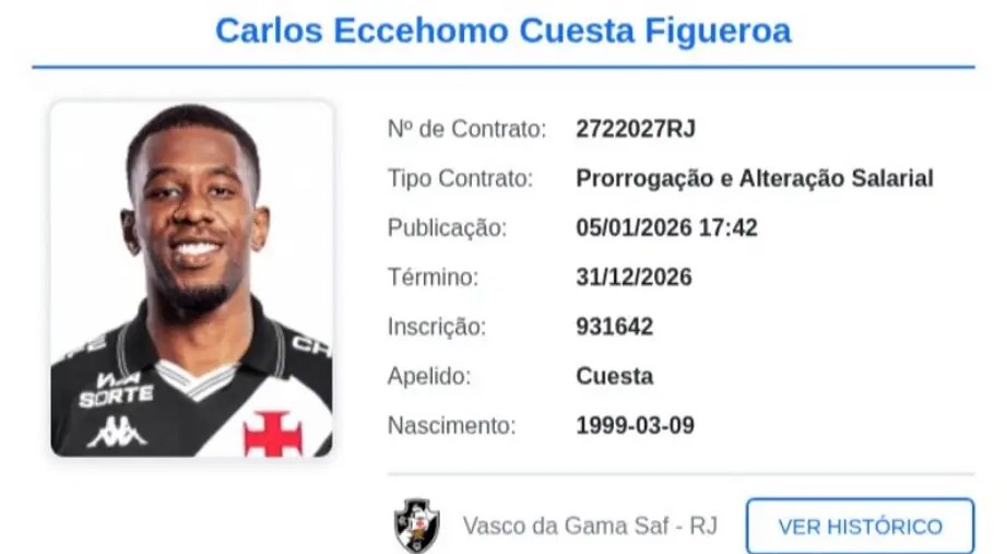 Vasco da Gama, Carlos Cuesta'nın sözleşmesindeki +1 yıl kiralama opsiyonundan yararlandı ve 26 yaşındaki stoperle 31 Aralık 2026'ya kadar geçerli yeni sözleşme imzaladı.