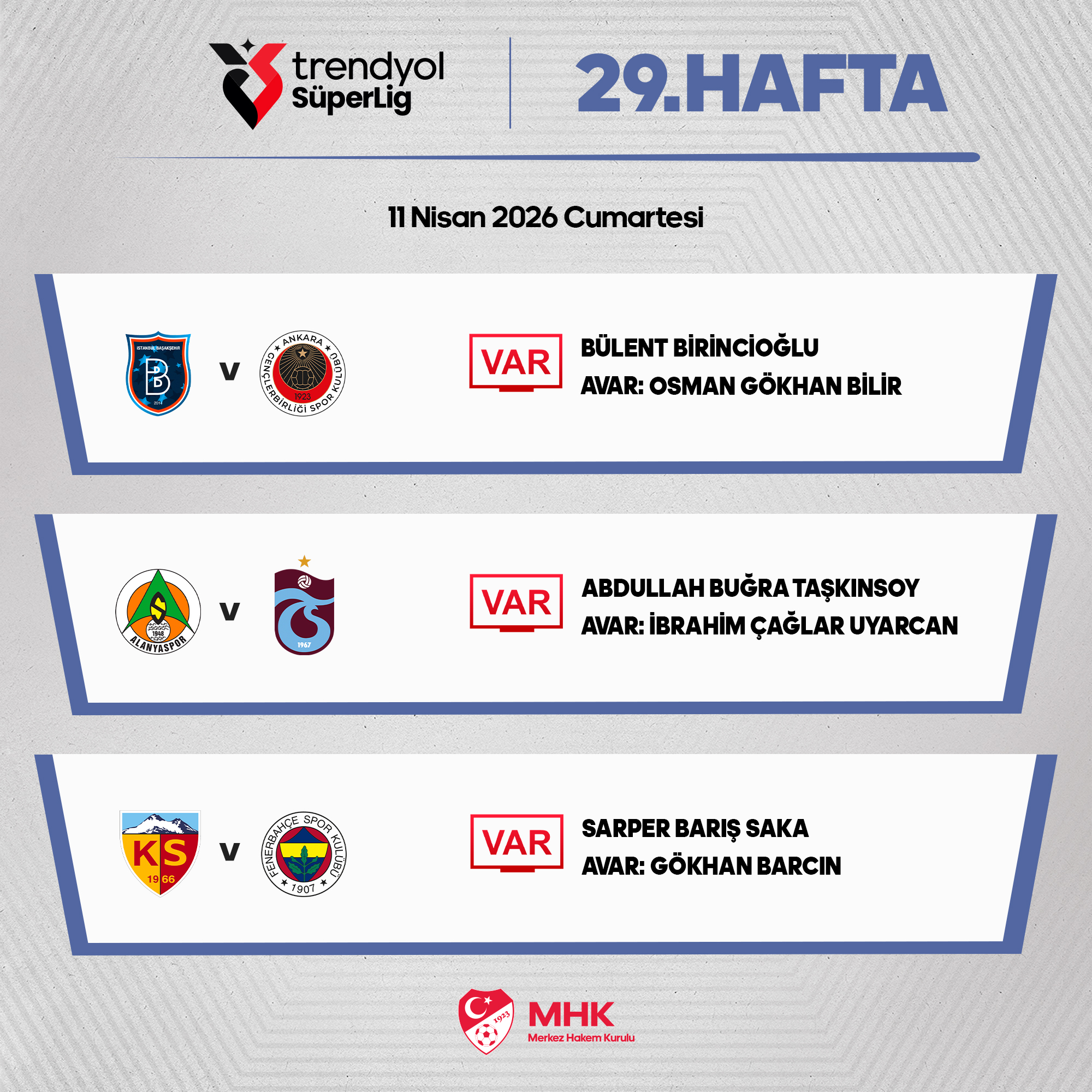 Corendon Alanyaspor - Trabzonspor maçının VAR hakemi Abdullah Buğra Taşkınsoy olurken, Zecorner Kayserispor - Fenerbahçe maçının VAR hakemi Sarper Barış Saka oldu.