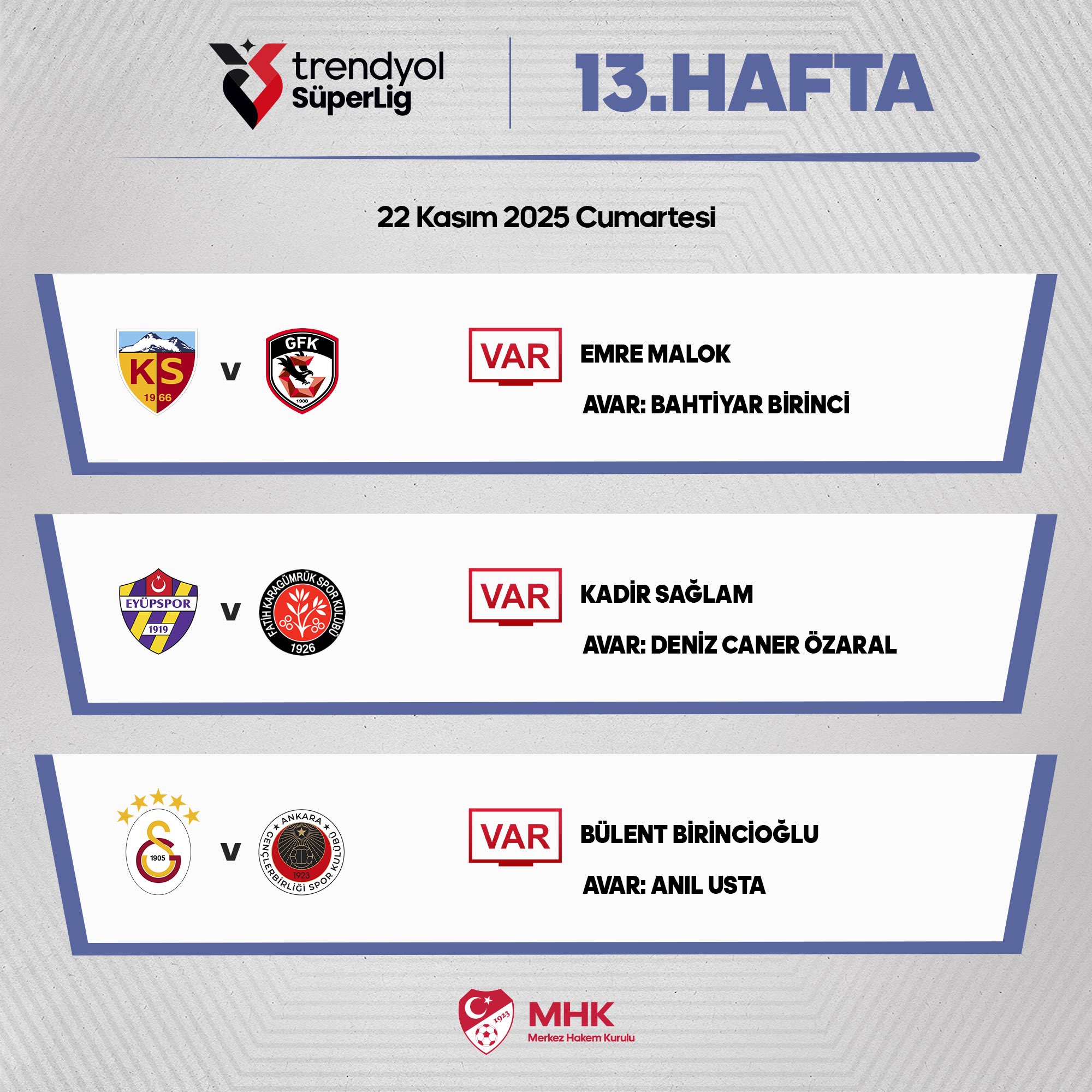 TRENDYOL SÜPER LİG ÖZETLERİ İÇİN TIKLAYINGalatasaray - Gençlerbirliği maçında Bülent Birincioğlu, ikas Eyüpspor - Mısırlı.com.tr Fatih Karagümrük maçında Kadir Sağlam ve Zecorner Kayserispor - Gaziantep FK maçında Emre Malok görev yapacak.
