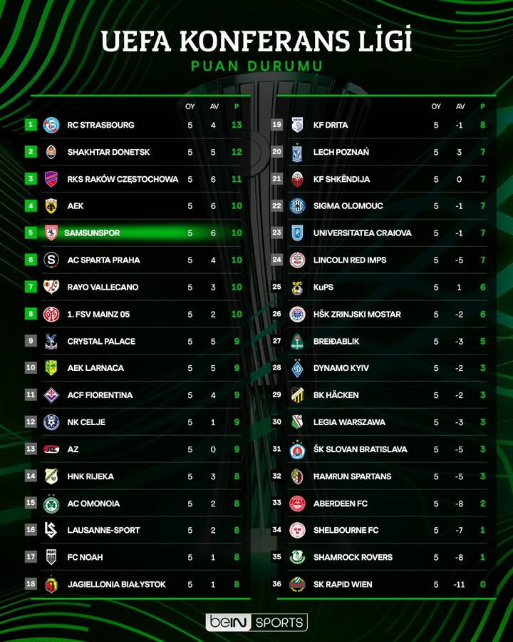 UEFA Konferans Ligi’nde beşinci maçlar sonucunda oluşan puan durumu.