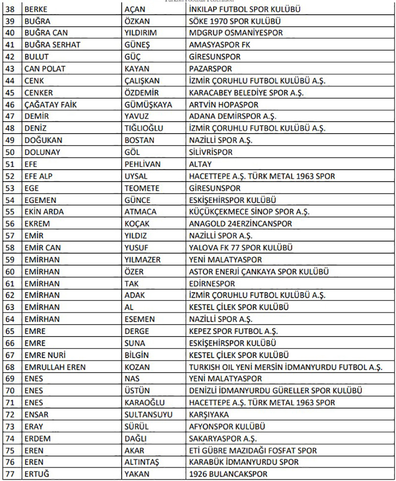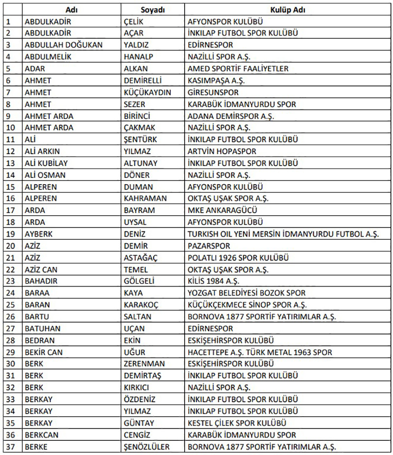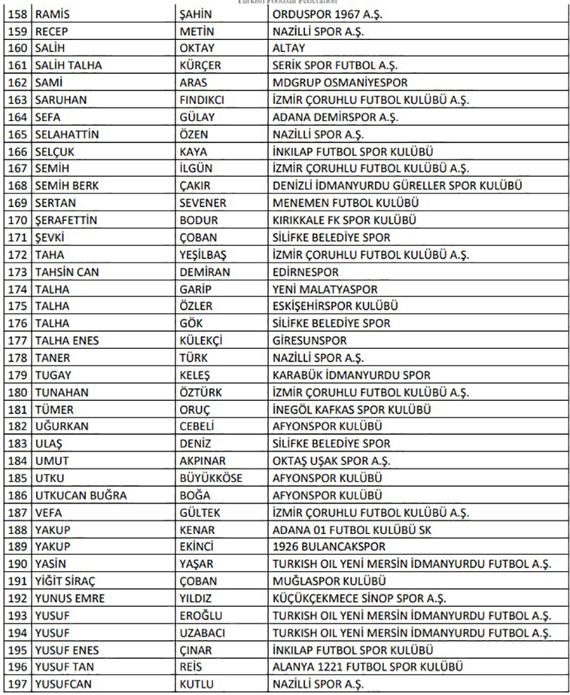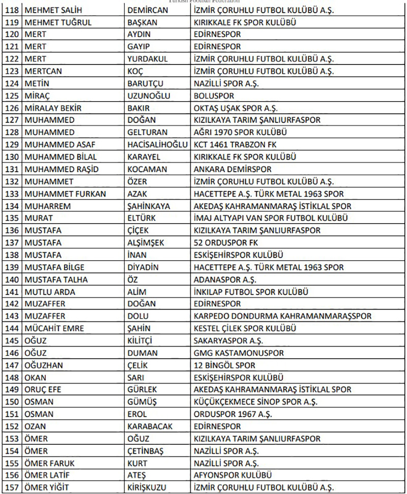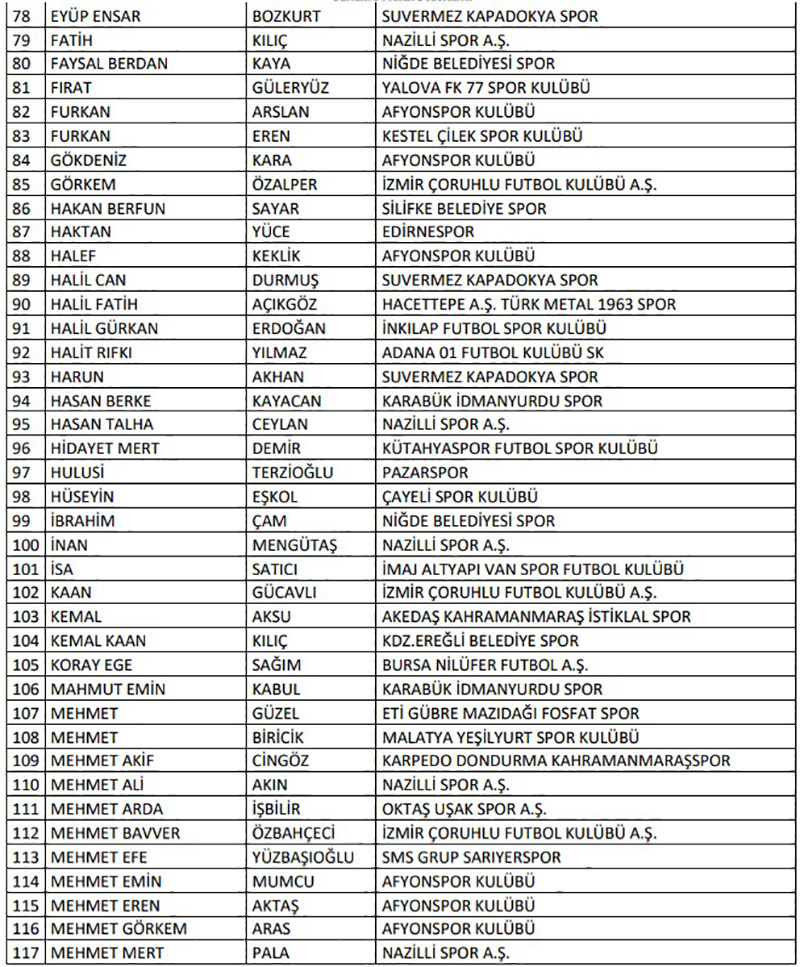 "Türkiye Futbol Federasyonu’nca profesyonel liglere yönelik olarak yürütülen bahis soruşturması kapsamında 10.11.2025 tarihinde PFDK’ya sevk edilen 1024 futbolcunun haricinde profesyonel liglerde yer alan kulüplerin “A Takım” listelerinde yer alan veya ilgili lig statüleri uyarınca esame listesine yazılarak profesyonel müsabakalarda oynatılabilen amatör statüdeki 658 futbolcudan bahis oynadığı tespit edilen aşağıdaki 197 futbolcunun Futbol Disiplin Talimatı’nın 57. maddesi uyarınca 08.12.2025 tarihinden itibaren tedbirli olarak PFDK'ya sevk edilmesine karar verilmiştir.