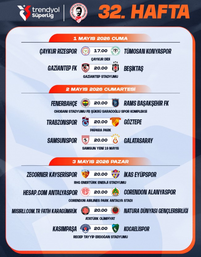 TRENDYOL SÜPER LİG ÖZETLERİ İÇİN TIKLAYINTürkiye Futbol Federasyonunun açıklamasına göre, ligde 32. haftanın müsabaka programı şöyle:
