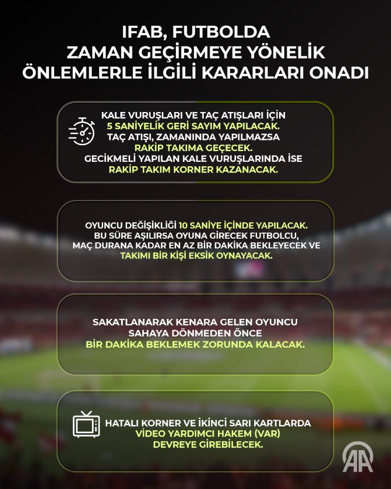 Uluslararası Futbol Birliği Kurulu (IFAB), yıllık toplantısında maç akışını iyileştirme ve tempo kesintilerini azaltmaya yönelik önlemlerle ilgili kararlara onay verdi.