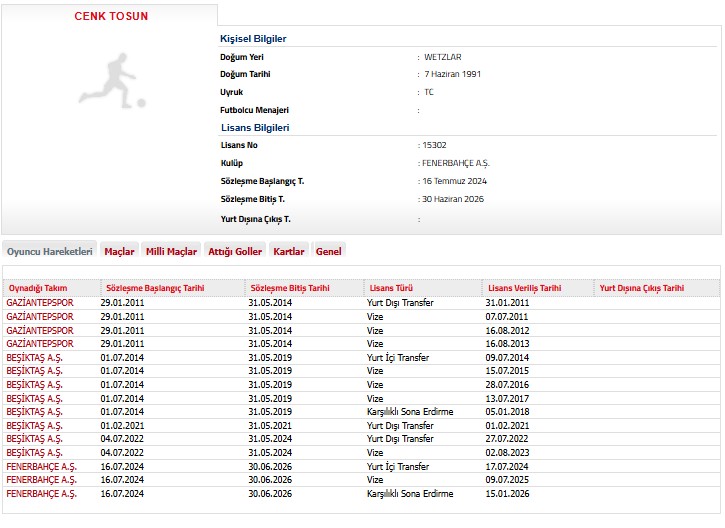 Fenerbahçe Kulübü, Cenk Tosun'un sözleşmesini karşılıklı anlaşmayla feshettiğini TFF'ye bildirdi.