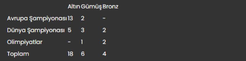 Milli sporcunun, toplam 28 madalya kazandığı Avrupa ve dünya şampiyonaları ile olimpiyatlarda elde ettiği başarılar şöyle: