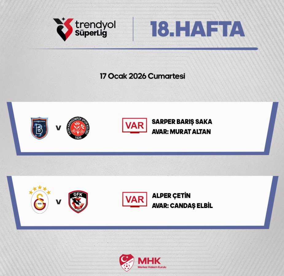 Galatasaray - Gaziantep FK maçının VAR koltuğunda Alper Çetin olacak. Rams Başakşehir - Mısırlı.com.tr Fatih Karagümrük mücadelesinde ise Sarper Barış Kaya görev yapacak.